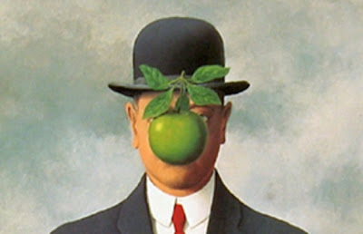 Detail from Le Fils de l'Homme, Rene Magritte -- 1964. Fair use of low-resolution detail of the copyrighted image for critical purposes hereby asserted. Magritte was born in the Walloonian province of Hainaut, not that of Luxembourg. But who is behind that apple, under that bowler hat?